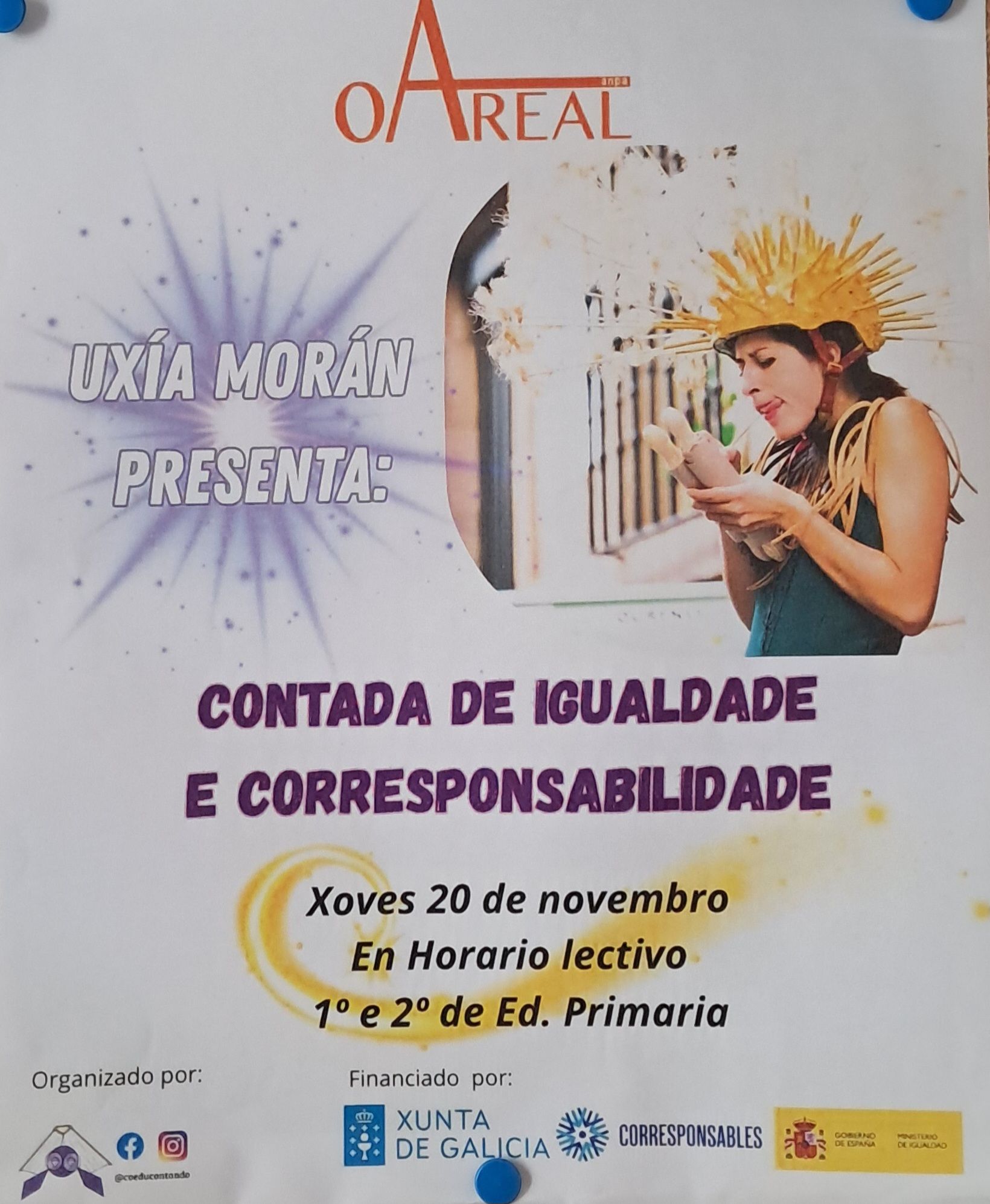 O xoves 20 de novembro os máis pequenos do cole tiveron a sorte de recibir a Uxía Morán. Esta fantástica contadora estaba invitada pola ANPA O AREAL dentro da subvención COORESPONSABLES.