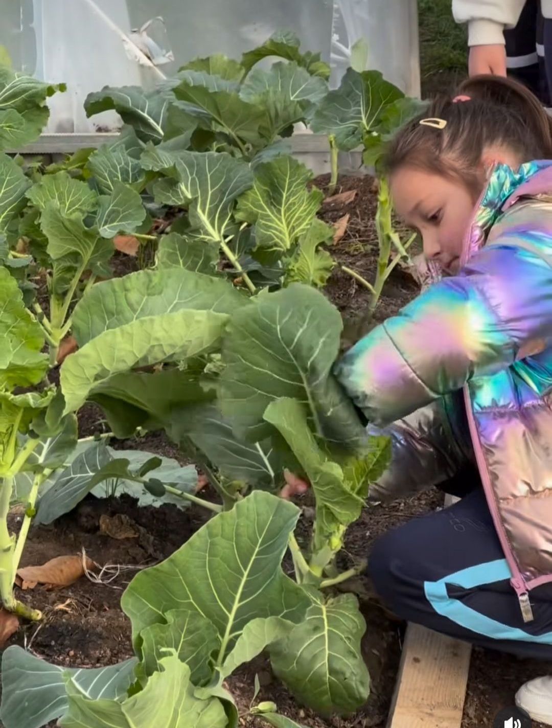 Esta imaxe xa ten uns meses. Aquí unha das nosas alumnas de primaria está a traballar na terra sementando berzas e grelos. Durante todo este tempo as nosas verduriñas foron medrando e xa vedes na seguinte foto como están agora.
